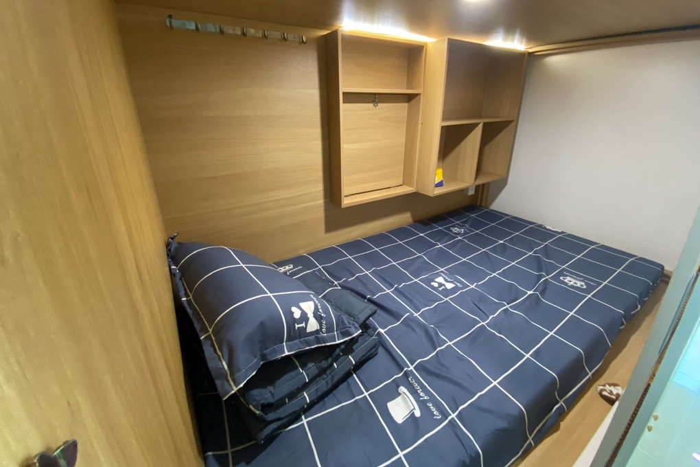 Hộp ngủ của Hân rộng 2m2, chỉ đủ một người nằm, bên trong có một kệ gỗ để quần áo và đồ đạc cá nhân cùng một chiếc bàn gấp.