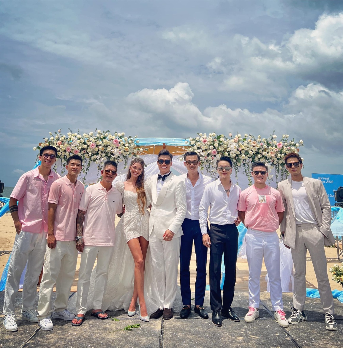 Đám cưới của đôi trẻ diễn ra bên bờ biển Vũng Tàu. Đám cưới có sự xuất hiện của dàn cầu thủ nổi tiếng như Quang Hải, Văn Hậu, Hà Đức Chinh. Các chàng cầu thủ mặc trang phục hồng trắng ấn tượng, lạ mắt.