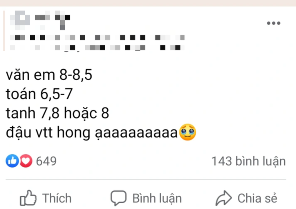 "Toán 6, văn 7, tiếng Anh 4, em có đỗ vào Hiệp Bình không?", "Mình toán 7, văn 7,5, tiếng Anh 5 có đỗ vào Võ Thị Sáu không mọi người ơi?... Tiếp đó là hàng loạt nhận xét, đánh giá, tư vấn. Kể cả lúc 2, 3 giờ sáng, các trang diễn đàn học sinh TPHCM chờ điểm thi lớp 10 vẫn sôi động với những status, comment liên tục quanh tâm trạng chờ điểm, lo trượt.