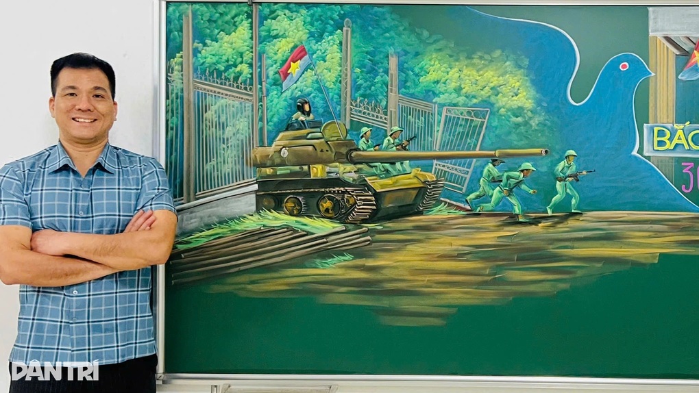 "Tôi muốn góp tiếng lòng vào ngày vui đại thắng, nhất là dấu mốc 50 năm, theo cách riêng của mình. Tôi tạo nên một tác phẩm nghệ thuật giản dị mà đầy ý nghĩa trên bảng lớp thân quen", thầy Nguyễn Trí Hạnh chia sẻ.