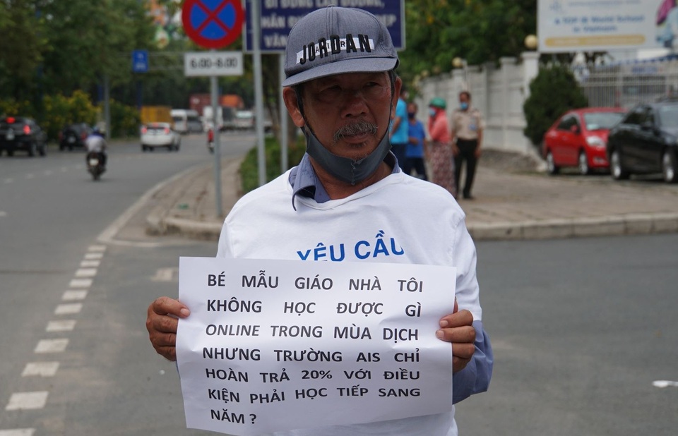 Phụ huynh Trường Quốc tế Úc (AIS Saigon) mặc đồng phục, tập trung trước cổng trường phản đối chính sách học phí của nhà trường trong đợt nghỉ tránh dịch Covid-19.