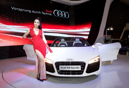 Audi R8 V10, mẫu xe thể thao thế hệ mới nhất của hãng xe sang của Đức xuất hiện tại Việt Nam theo diện tạm nhập tái xuất từ hồi tháng 8/2013 (trong dịp kỉ niệm 5 năm Audi chính thức có mặt tại Việt Nam) và được giữ lại để ra mắt trong dịp triển lãm lần này. Với những đòi hỏi khắt khe về hệ thống dịch vụ, bảo hành, cũng như năng lực quản lí và tình hình kinh doanh, Audi AG hiện vẫn chưa cho phép mẫu xe này được có mặt tại thị trường Việt Nam một cách chính thức.