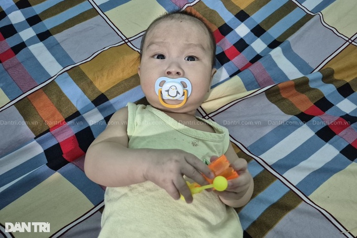 Bế con trai 8 tháng tuổi trên tay, chị Lê Thị Hải (27 tuổi, trú ở tổ dân phố 7, thị trấn Nưa, huyện Triệu Sơn, tỉnh Thanh Hóa) vừa vỗ về, vừa rưng rưng nước mắt.