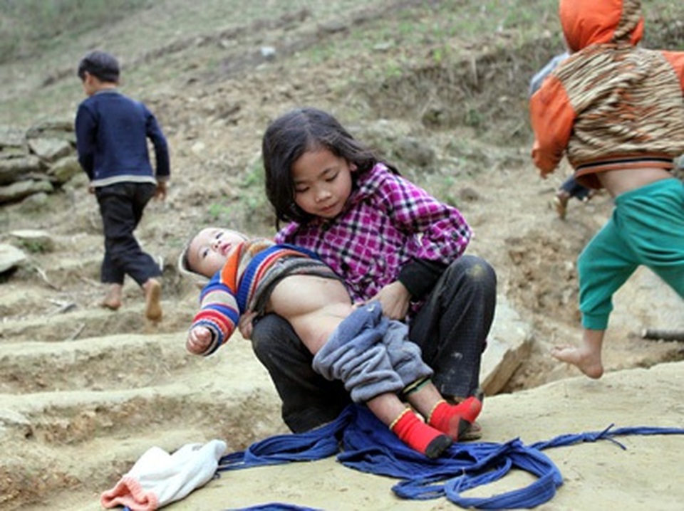 Ảnh Hoàng Thị Mũ lúc mới học lớp 3 nhưng đã phải thay cha mẹ chăm sóc hai em thơ trong cảnh đói rách nghèo khổ.
