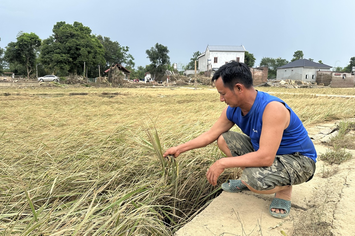 Sau khi lũ rút, anh Nguyễn Văn Hoàn, chiến sĩ An ninh cơ sở (ANCS) của xã Phú Bình, tỉnh Thái Nguyên, dẫn tôi về nhà đi trên những cánh đồng lúa đổ rạp, nhuốm màu bùn đất. Hơn 4 sào lúa và hoa màu của gia đình anh cũng bị mất trắng.