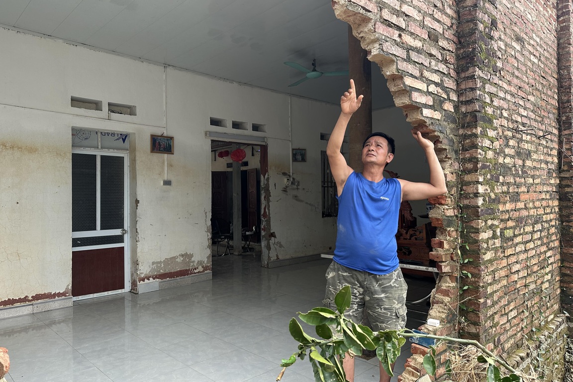 Một khoảng tường phía sau của căn nhà cấp bốn mà gia đình anh Hoàn đang sinh sống bị "con tàu ma" đâm đổ sập (Ảnh: Hồng Ngân).