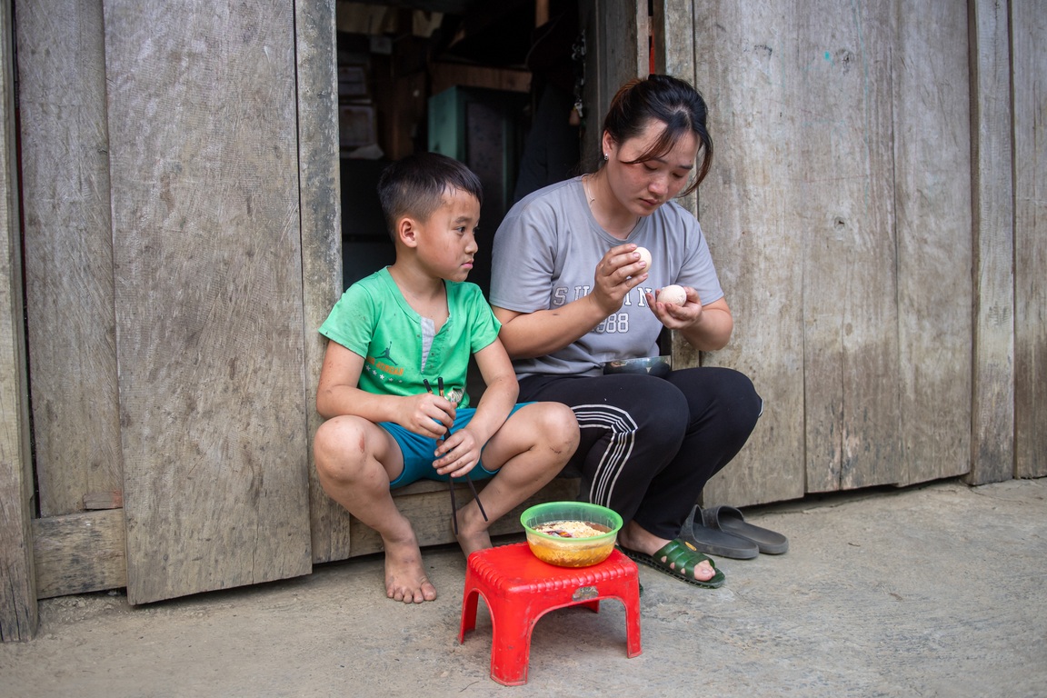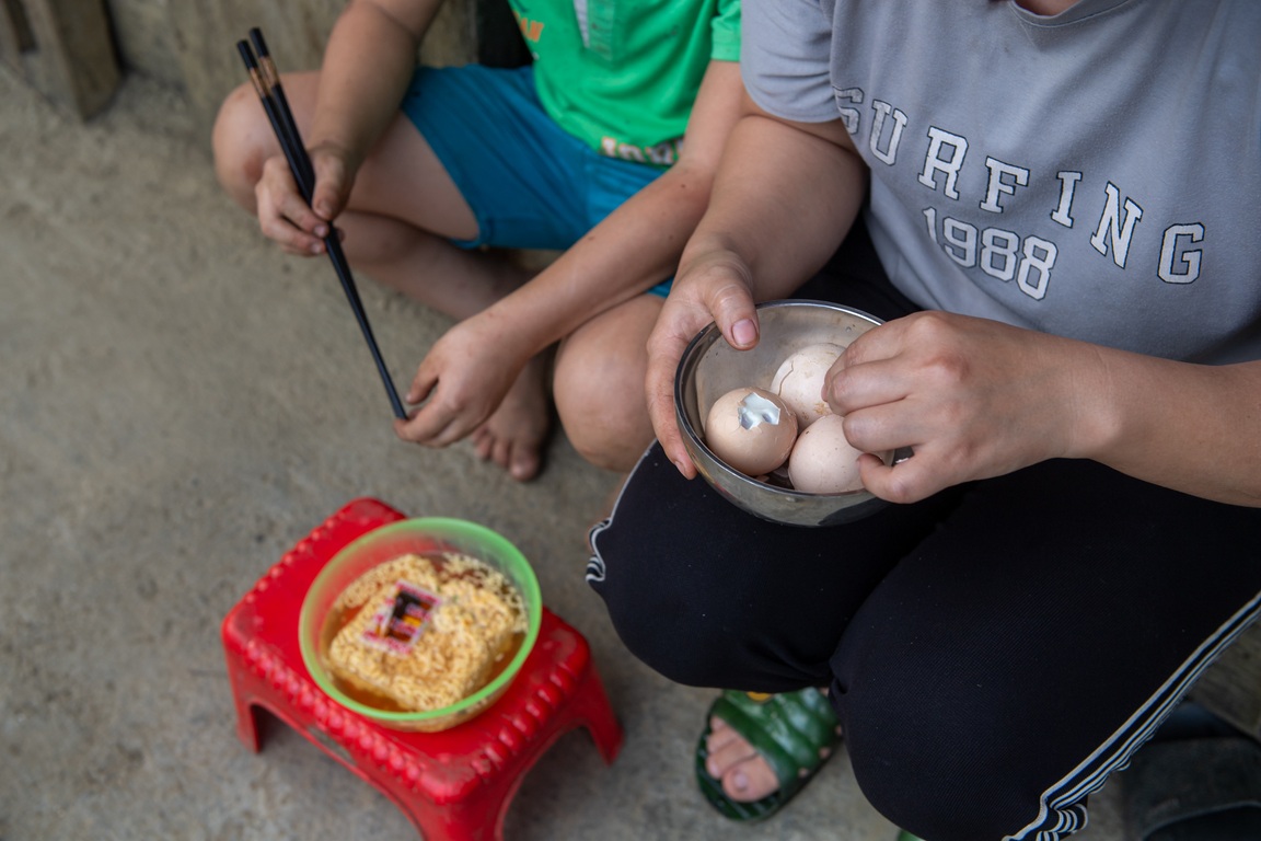 Trong ngôi nhà tuềnh toàng đã xuống cấp ở xóm Bản Luầy, xã Quảng Lâm (xã Thạch Lâm, huyện Bảo Lâm cũ), tỉnh Cao Bằng, bữa cơm trưa của 3 mẹ con chị Mã Thị Hương (27 tuổi) chỉ có 3 quả trứng luộc và gói mì tôm.