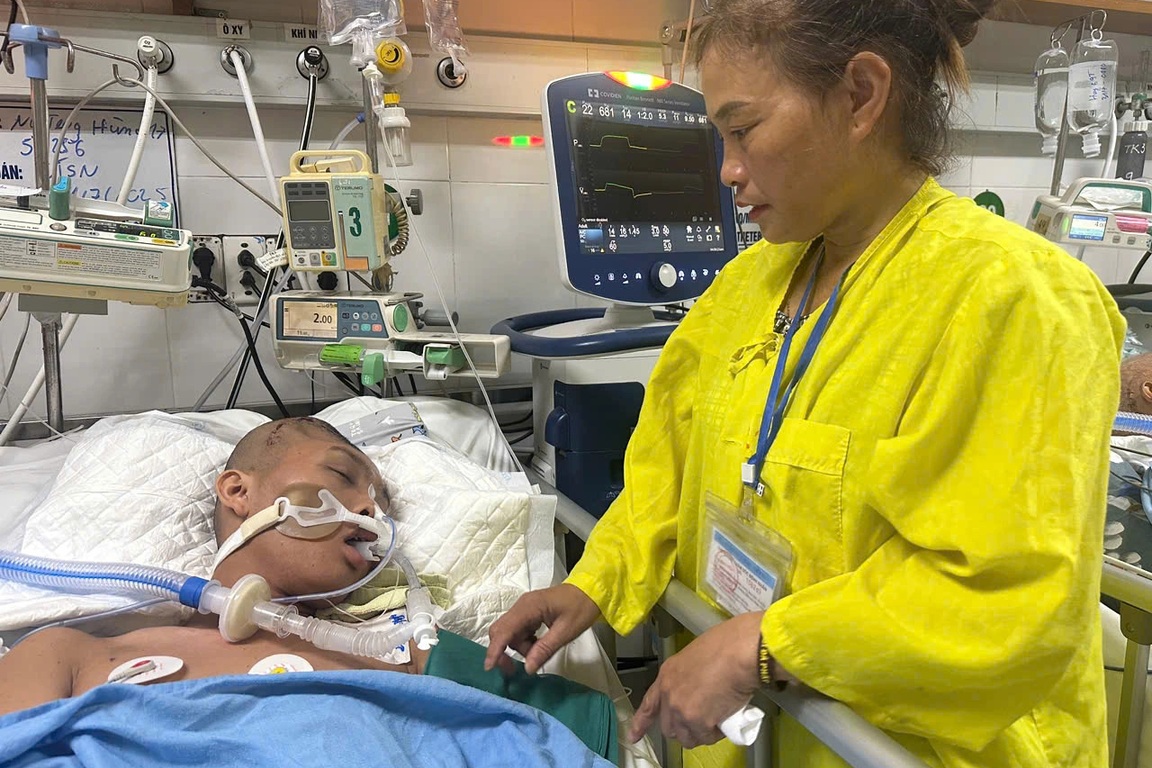 Sau gần 1 tháng nhập viện, Hùng vẫn nằm bất động, hơi thở yếu ớt, sự sống mong manh hoàn toàn dựa vào máy móc hỗ trợ.