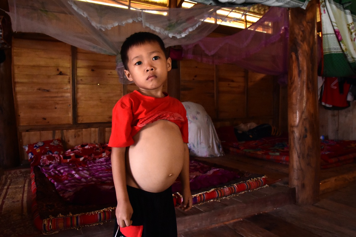 Trong căn nhà cũ kỹ nằm cuối con đường đất ở bản Hong Lực, xã Chiềng Sinh, tỉnh Điện Biên, vợ chồng ông Lường Văn Hoài (55 tuổi) và bà Lò Thị Xiên (53 tuổi) ngồi lặng lẽ bên đứa cháu nội Lường Bảo Khang (SN 2019) gầy yếu, xanh xao, bụng trướng to như quả dưa hấu.