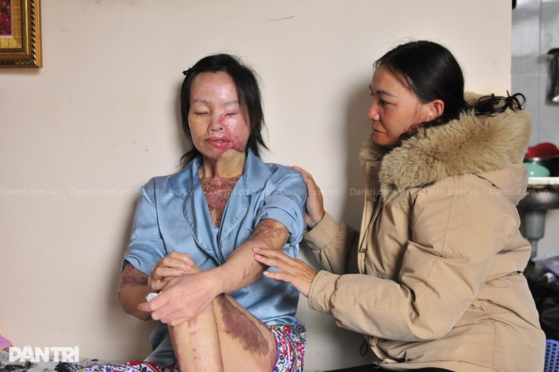 Đưa tay sờ lên gương mặt đầy những vết sẹo, chị Nhung nghẹn ngào: “Các bác sĩ đã nhiều lần phẫu thuật, ghép da nhưng khuôn mặt của tôi đã biến dạng. Các vết bỏng trên cơ thể tuy đã lành nhưng da bị co rút, đau đớn”.