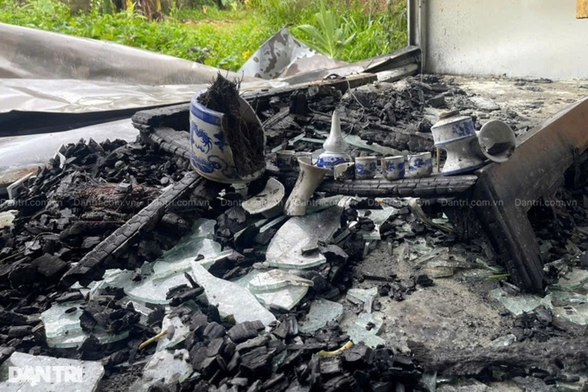 Bàn thờ cùng di ảnh chồng bà Dung đã hóa thành tro tàn sau vụ cháy (Ảnh: Chính quyền cung cấp).