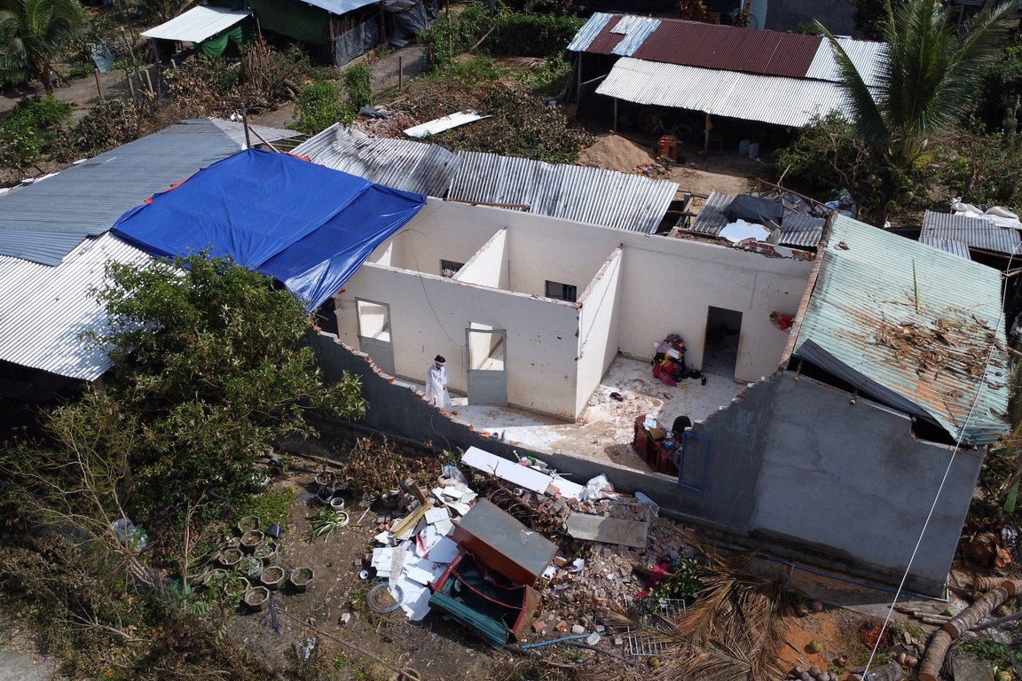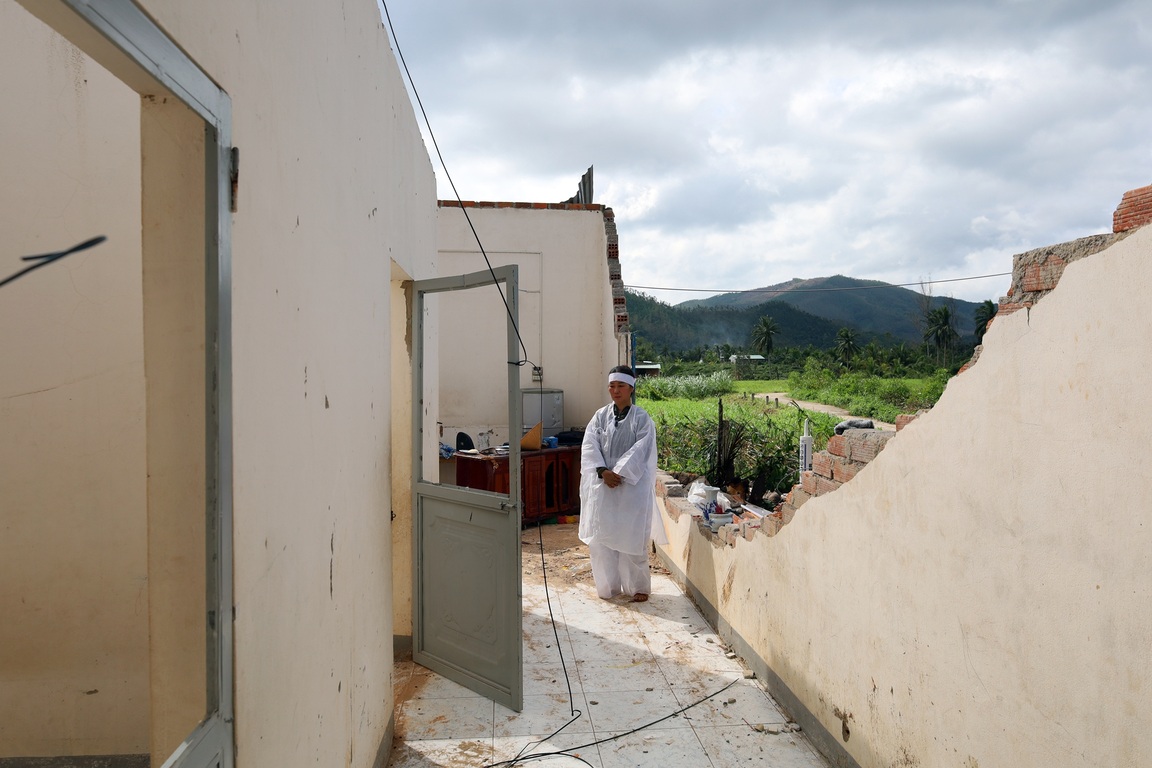 Đến tối 6/11, khi gió bão bắt đầu rít mạnh, mái nhà rung bần bật, anh T. đã đưa 2 con và một người cháu vào nhà tắm trú ẩn (thời điểm này, con gái đầu của anh chị đang đi làm ở Nha Trang). Anh và chị Hà mang thang ra tiếp tục giằng mái tôn.
