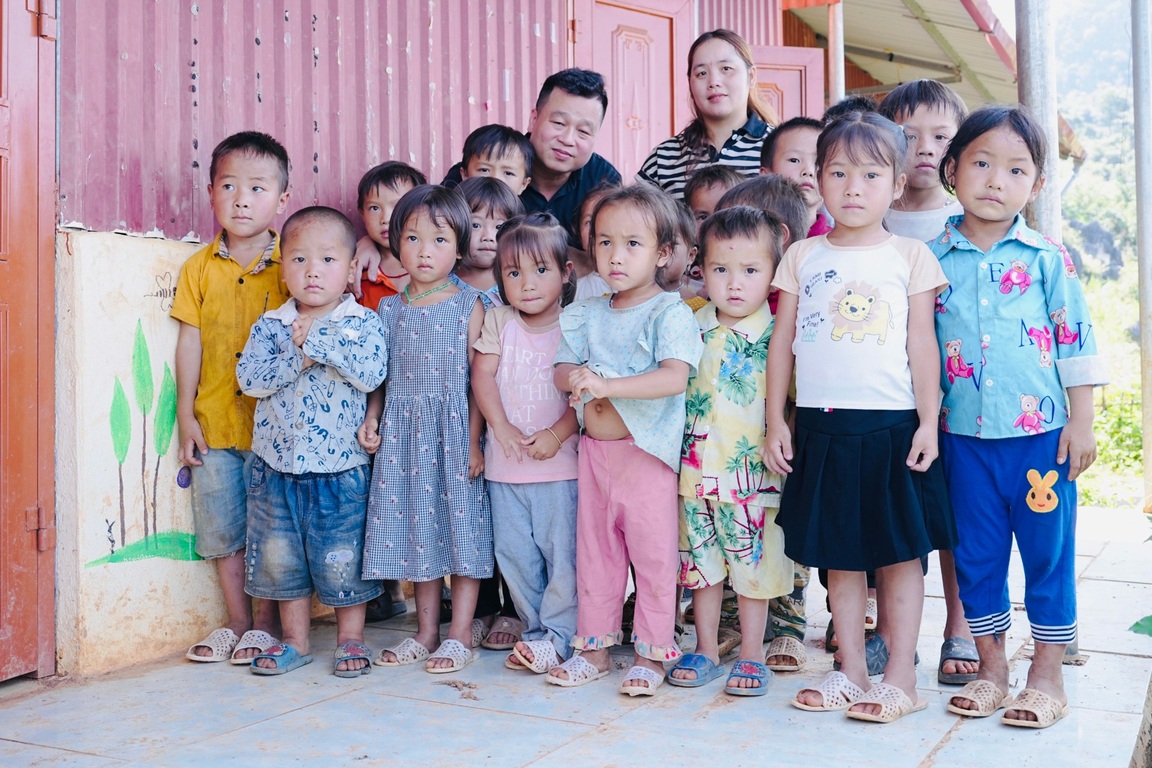 Những đứa trẻ từ 3-5 tuổi và giáo viên tại điểm trường "khát mưa", tại xóm Lũng Khỉnh, xã Thông Nông, tỉnh Cao Bằng (Ảnh: Quốc Hưng).