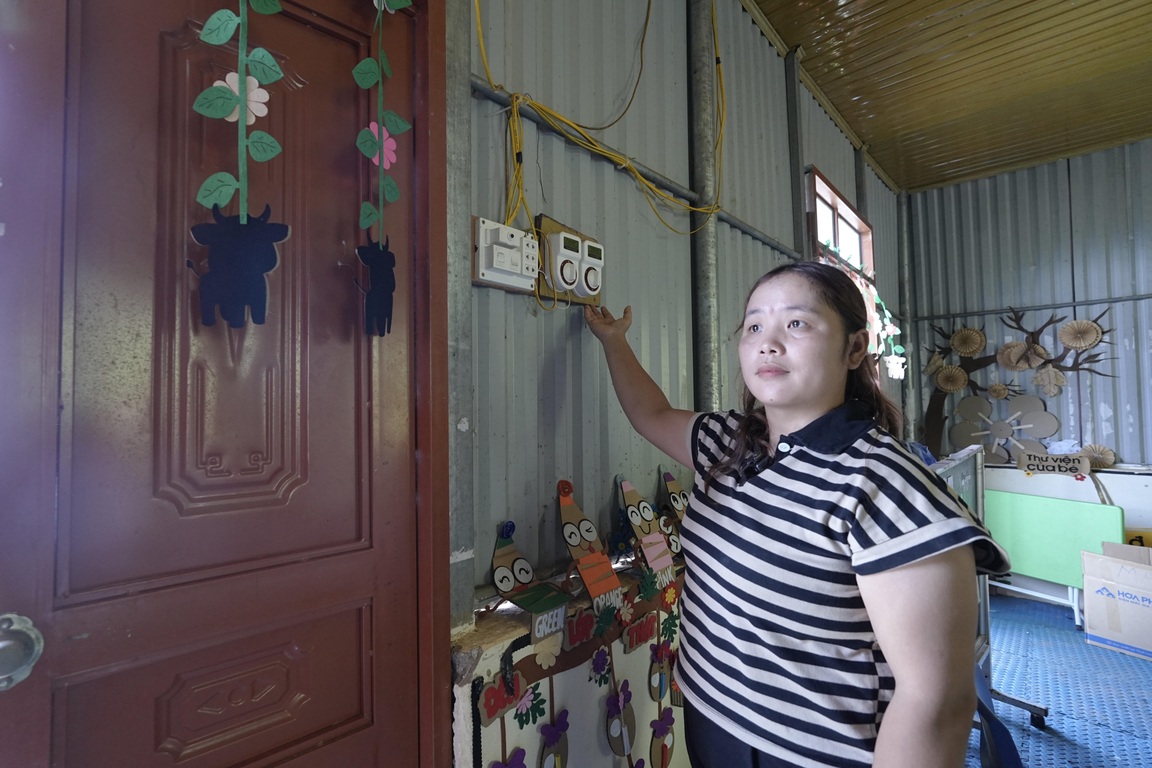 Toàn bộ tường lớp học được làm bằng những tấm tôn mỏng, mái cũng được lợp bằng tôn. Trên tường là những bảng điện được đóng thô sơ. Cô Thuý kể, vừa rồi điện rò ra tường, cũng may cô trò không ai bị làm sao.